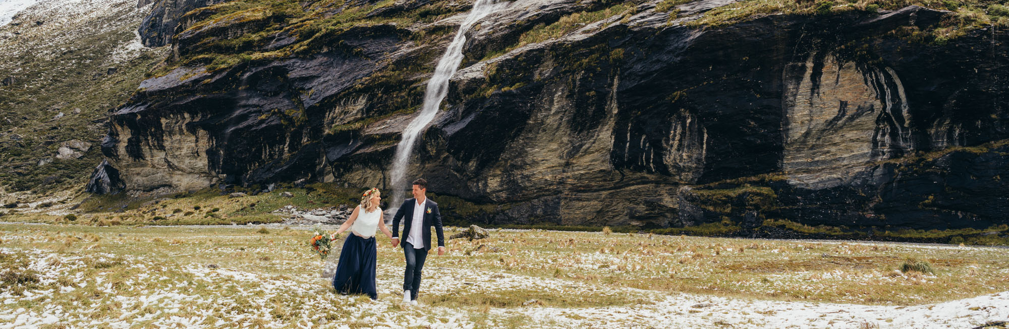 Earnslaw Burn in Mt Aspiring National Park is one of our favourite wedding locations. Our helicopter company holds exclusive landing rights for this incredible spot. Enjoy spectacular views of braided rivers and historical gold-mining sites on the flight before landing on the valley floor. A perfect location for a LOTR elopement as the site was a set location for The Hobbit movie. The bright blue ice of Earnslaw Glacier looms 2000m overhead, feeding multiple waterfalls which cascade down the valley walls. Imagine your ceremony set in this lush valley with the sound of cascading water and the rare view of a glacier directly above.